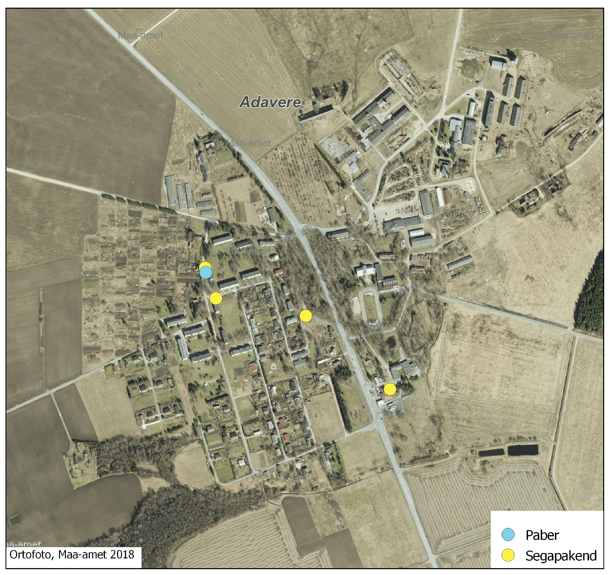 | Adavere alevik (vt kaardil) kaupluse juures Kuuse - Kesk tänava rist Kuuse tn 8 Pärna tn | ||
