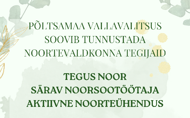 Kandidaatide esitamise tähtaeg on 23. mai 2025. Põltsamaa valla noortevaldkonna tegijate tunnustamissündmus toimub juunikuus.