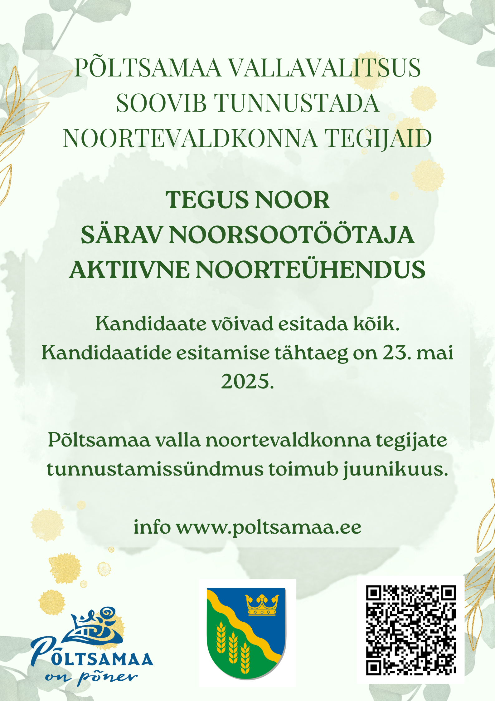 Kandidaatide esitamise tähtaeg on 23. mai 2025. Põltsamaa valla noortevaldkonna tegijate tunnustamissündmus toimub juunikuus.