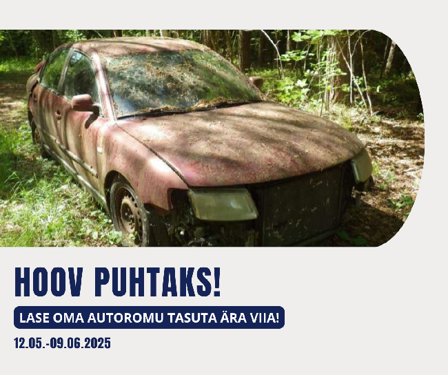 Romusõiduki tasuta äraveo saab tellida alates 12. maist kuni 9. juunini. Veo tellimiseks tuleb ühendust võtta Eesti Autolammutuste Liiduga (info@elv.ee, +372 578 77 233) või Kuusakoski AS-ga (firma@kuusakoski.ee, 13 660). Veendu, et romule järgi tulevale puksiirile oleks tagatud vaba ligipääs ja ohutu teenindusruum.