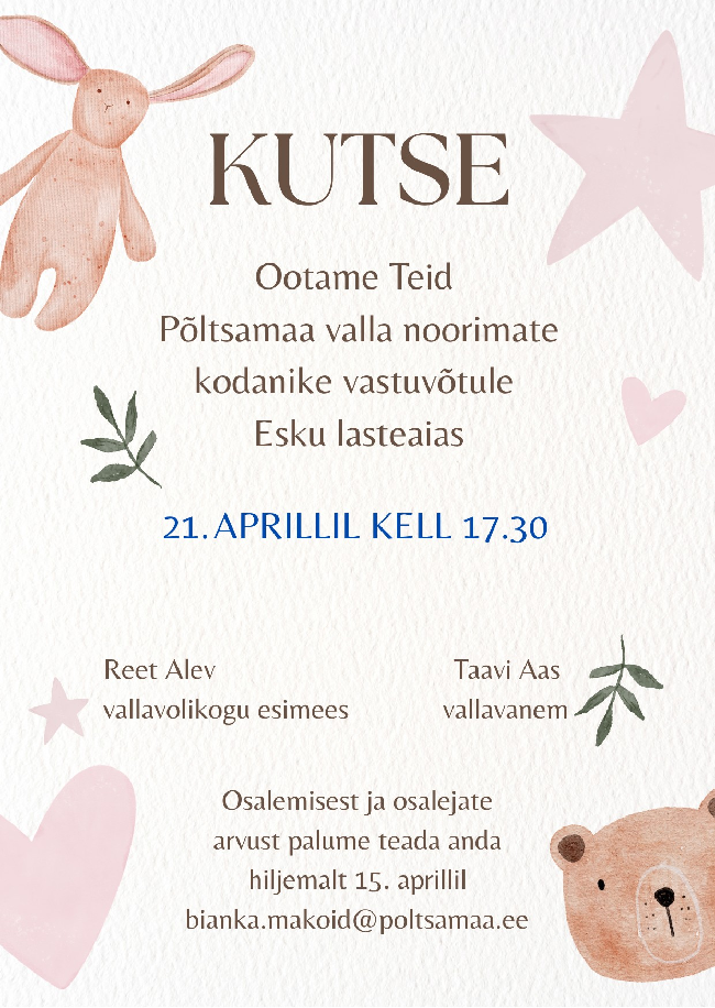 Lusikapidu toimub 21. aprillil kell 17.30 Esku lasteaias (Esku küla, Kooli tee 2). Valla noorimate kodanike vastuvõtule kutsutakse lapsed, kes on sündinud ajavahemikus 1.08.2025 - 31.12.2025....