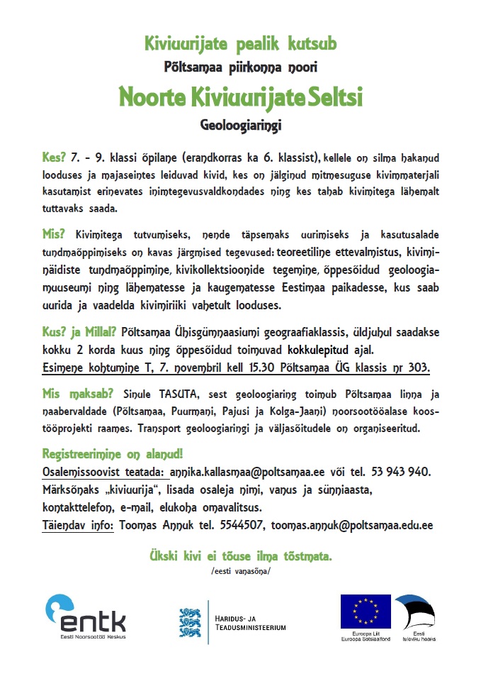 Noorte Kiviuurijate Seltsi kuuluvad Põltsamaa piirkonna 7. - 9. klassi õpilased, kes tahavad kivimitega lähemalt tuttavaks saada. Geoloogiaringi raames toimuvad kokkusaamised üldjuhul kaks korda kuus, kohtutakse klassiruumis ja käiakse õppesõitudel, et uurida ja vaadelda kivimiriiki vahetult looduses.