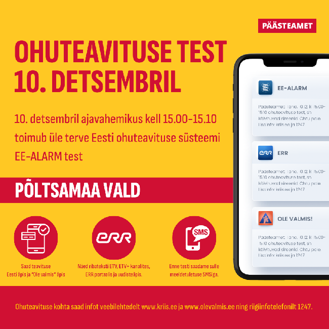 Päästeamet testib kolmapäeval, 10. detsembril ohuteavituse süsteemi EE-ALARM. Sel