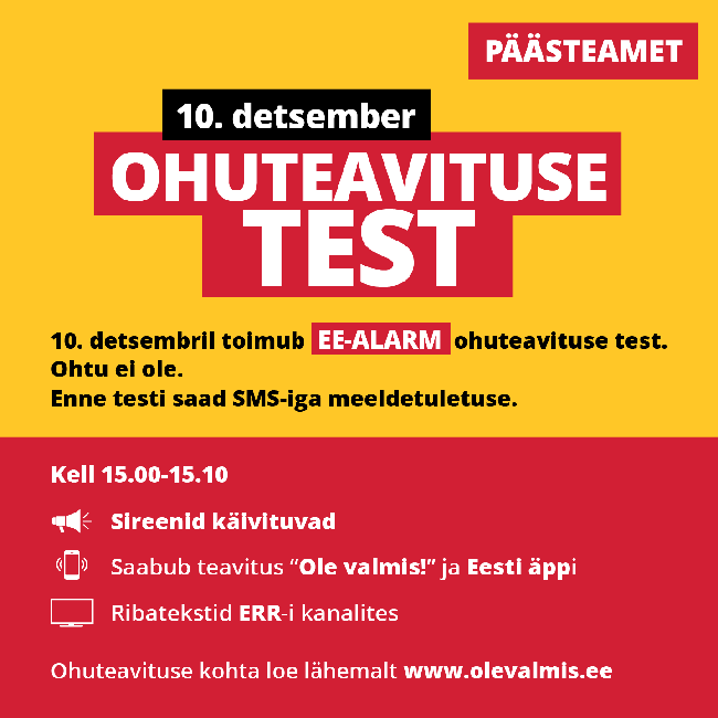 Päästeamet testib kolmapäeval, 10. detsembril 2025 ohuteavituse süsteemi EE-ALARM. Sel päeval käivitatakse kõik ohuteavituse kanalid.