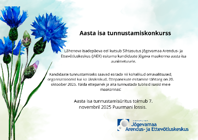 Läheneva isadepäeva eel kutsub Sihtasutus Jõgevamaa Arendus- ja Ettevõtluskeskus (JAEK) esitama kandidaate Jõgeva maakonna aasta isa aunimetusele.