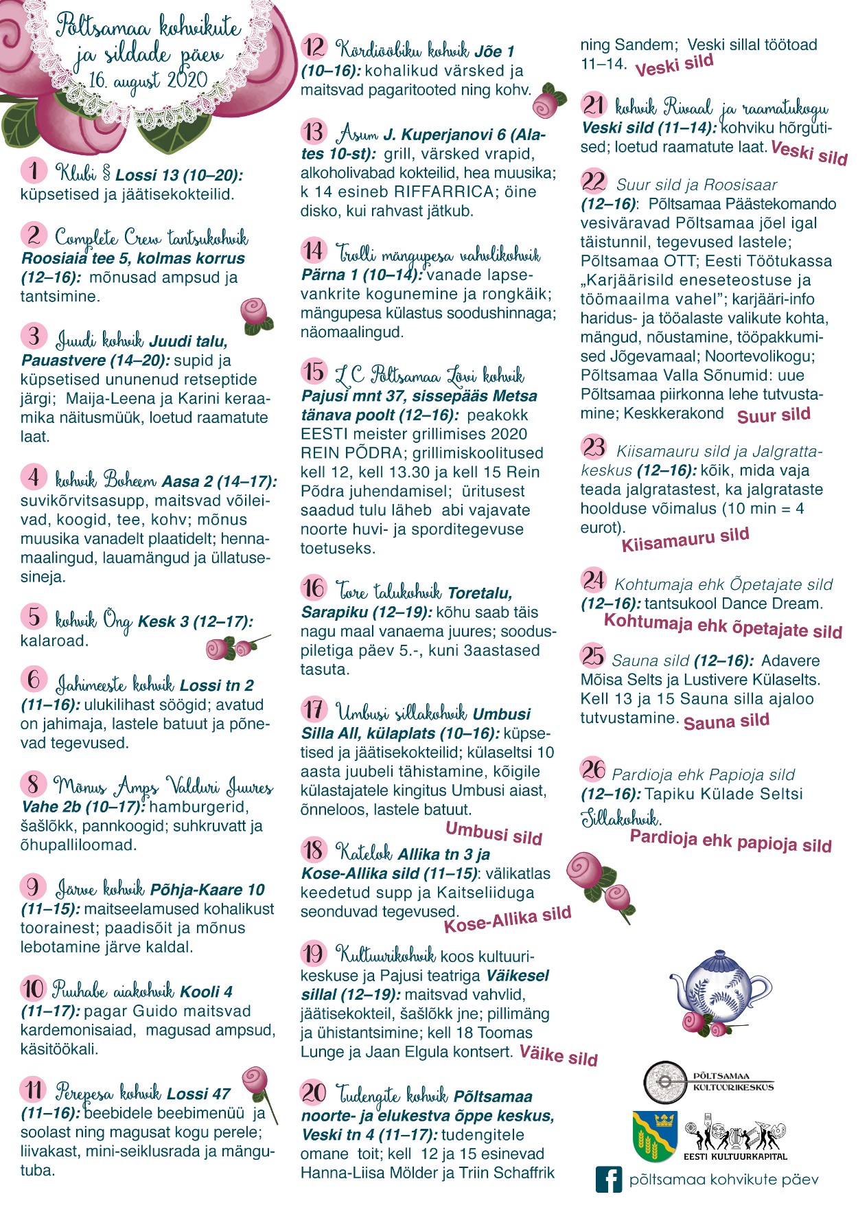 - 12–16 Suur sild ja Roosisaar : Põltsamaa Päästekomando vesiväravad Põltsamaa jõel igal täistunnil, tegevused lastele; Eesti Töötukassa „Karjäärisild eneseteostuse ja töömaailma vahel"; karjääri-info haridus- ja tööalaste valikute kohta, mängud, nõustamine, tööpakkumised Jõgevamaal; Noortevolikogu; Neroli kohvik; Põltsamaa Valla Sõnumid: uue Põltsamaa piirkonna lehe tutvustamine; Keskkerakond